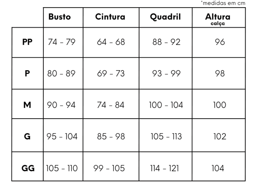 Tabela de Medidas: